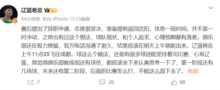 这个消息应该是比较真实的,“辽篮老总”随后继续补充:23年的时候,我爆料杨导没续约,没少挨骂。说实话,经历那次之后,我早就看淡这些了,什么热度还是流量,屁用没有,还惹一身骚。为啥这次还是和大伙说了一些球队的情况,就是因为辽篮都打成这样了,还能看球的真的都是铁杆球迷了,有些事得摆到桌面解决了,当断则断,球能输,不能这么稀里糊涂输了。